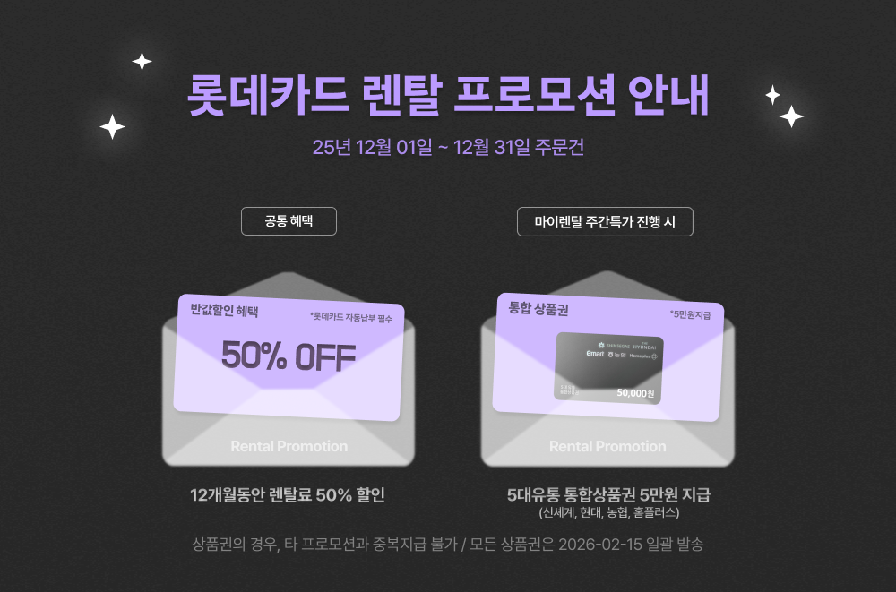 - 결제일할인 혜택을 받은 고객이 렌탈 중도 계약해지 또는 3회 이상 렌탈료 연체 시, 결제일할인 혜택이 중단될 수 있으며 롯데카드는 할인받은 혜택 금액을 다시 청구할 수 있습니다.