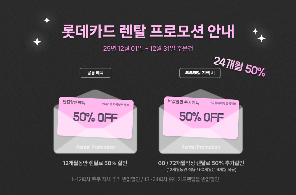 - 결제일할인 혜택을 받은 고객이 렌탈 중도 계약해지 또는 3회 이상 렌탈료 연체 시, 결제일할인 혜택이 중단될 수 있으며 롯데카드는 할인받은 혜택 금액을 다시 청구할 수 있습니다.